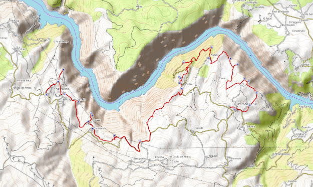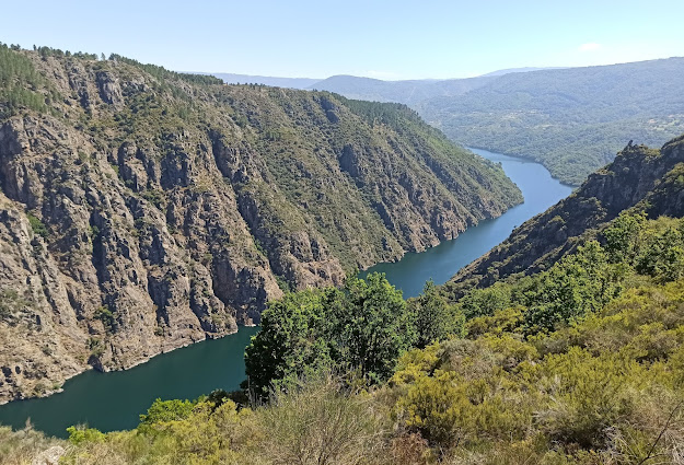 Retorno sobre mis pasos hasta el cruce por el que discurre el Gr 56, lo sigo hasta Cerreda donde se encuentra el mirador das Escadas. vuelvo atrás y continuo por el Gr 56 hasta Vilouxe, aquí tenemos dos miradores, son de los mas bonitos ya que coge la curva del río.